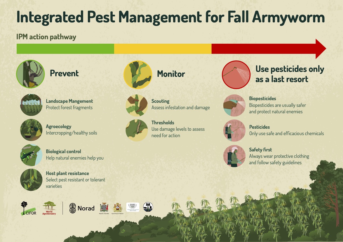 The infographics are designed to be printed as foldable cards that farmers can carry in their pocket for easy reference. The graphics provide an overview of fall armyworm natural enemies as well as action pathways to IPM.